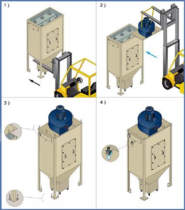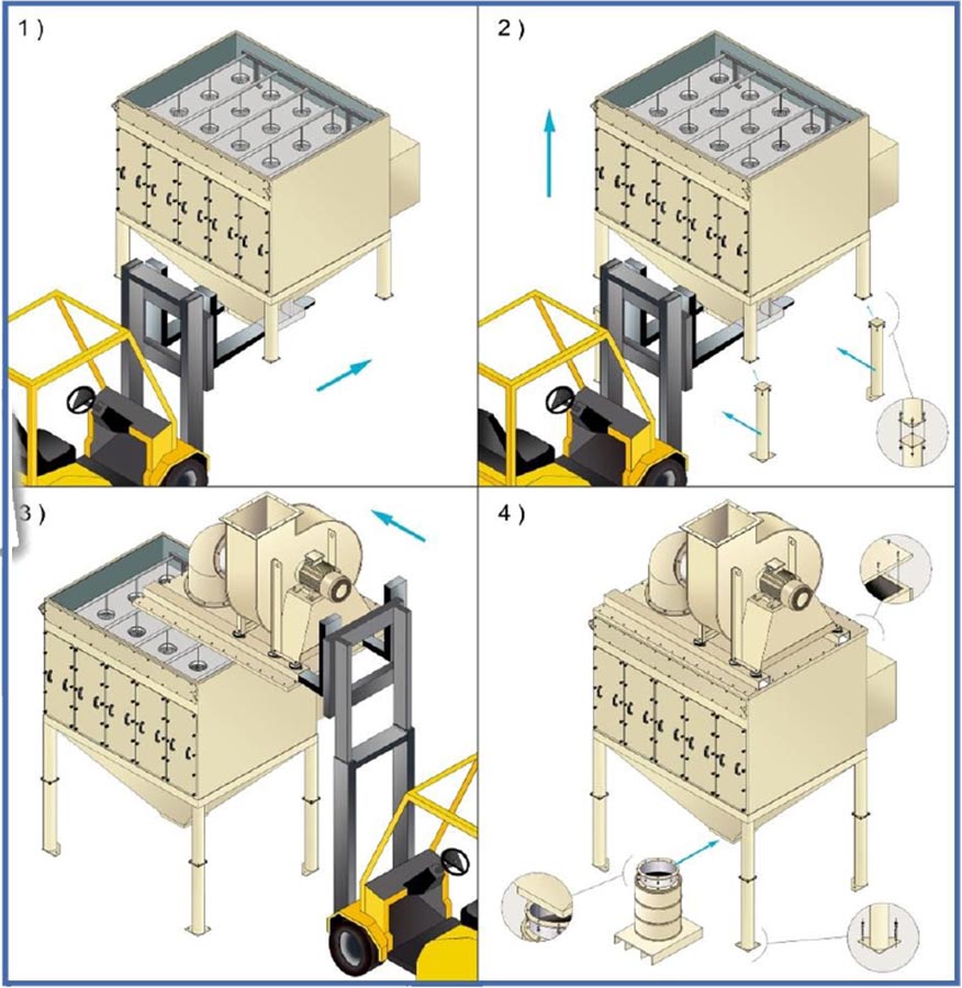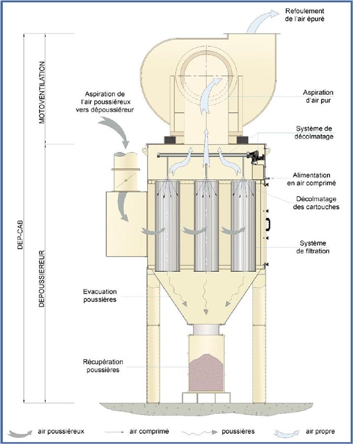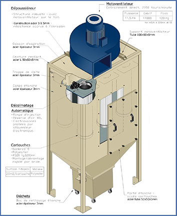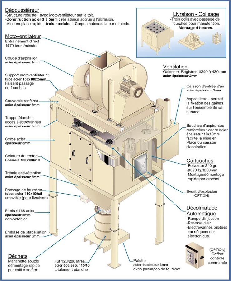 - Fertigungsqualität - Autonome Ausrüstung - Robuste Bauweise - Schnelle Installation und Inbetriebnahme - Kompaktes Gerät mit Lüfter oben - Automatische Entstopfung mit Sequenzer - Geschützte Magnetventile zum Entfernen von Verstopfungen - Filtration durch Polyesterkartuschen - Explosionsdruckentlastung (optional) - Abfalltrommel mit großem Fassungsvermögen - Erfüllt die Entladungsnormen - Die behandelten Durchflussraten reichen von 9.000 bis 240.000 m3/h.